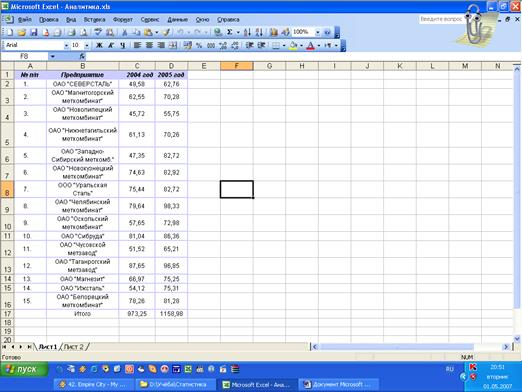 В последнем задании расчетной части рассчитан уровень затрат на рубль товарной продукции и его динамика по каждому виду и в целом по трем видам продукции за каждый период. В аналитической части работы проведено исследование изменения уровня затрат на рубль товарной продукции организаций в 2004 и 2005гг. по данным сайта www.gks.ru. Изучение проводилось средствами пакета программ MS Excel.