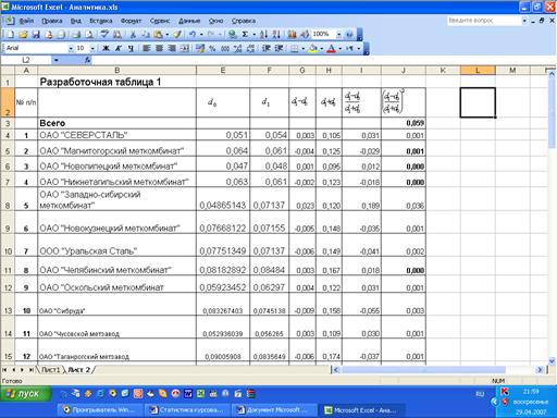 В этой части работы изложены результаты проведенного статистического исследования изменения уровня затрат на рубль товарной продукции организаций. Изучение проводилось средствами пакета программ MS Excel.