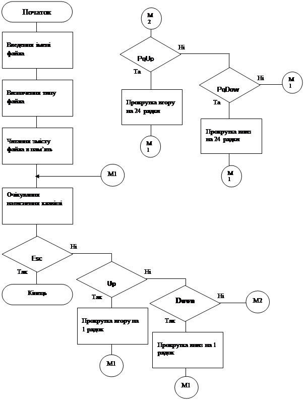 Після відкриття і читання файла програма чекає на натиснення клавіші. Використовується переривання 16 – функція 0. Потім аналізується код клавіші. Якщо код = 1 (вихід), то програма завершує роботу. Обробляються також клавіші “вгору”, “вниз”, “сторінка вгору” і “сторінка вниз”. Програма містить 3 групи функцій для кожного типу перегляду, кожна з яких містить по 3 функції: відображення на екрані поточного кадру, прокрутка зображення вгору і вниз.
