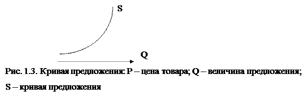 Закон предложения состоит в том, что при прочих равных условиях количество предлагаемого продавцами товара тем выше, чем выше цена этого товара, и наоборот, чем ниже цена, тем ниже величина его предложения. Иллюстрацией закона предложения является кривая, показывающая количество товара, которое продавцы предлагают к продаже по разным ценам в течение определенного периода (рис. 1.3).