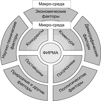 Микросреда представлена силами, имеющими непосредственное отношение к самой фирме и ее возможностям по обслуживанию клиентуры, т.е. поставщиками, маркетинговыми посредниками, клиентами, конкурентами и контактными аудиториями. Макросреда представлена силами более широкого социального плана, которые оказывают влияние на микросреду такими, как факторы демографического, экономического, технического, политического, культурного характера.