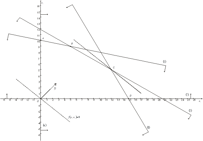 Многоугольник решений . Для нахождения максимума функции построим начальную прямую и вектор . Передвигая прямую вдоль вектора получим, что максимальное значение наша прямая принимает в точке точке пересечения прямых и .