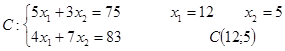 Оптимальный план найденный геометрическим способом и симплексным методом совпадают. Предприятию необходимо выпускать 12 единиц продукции первого вида и 5 единиц продукции второго вида. В этом случае предприятие получит прибыль денежных единиц.