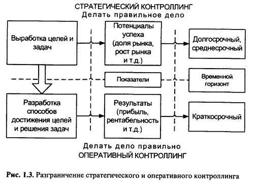 Стратегический контроллинг определяет цели и задачи для оперативного контроллинга, т.е. ставит нормативные рамки. Оба рассматриваемых направления отличаются по охватываемому временному горизонту. Так, оперативный контроллинг реализует свои функции на краткосрочном отрезке времени: до года. Стратегический контроллинг в современном менеджменте не привязан жестко к временным рамкам, хотя чаще всего речь идет о средне- и долгосрочном периоде.