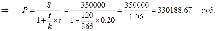 Через 120 дней после подписания договора должник уплатил 350 тыс.руб.. Кредит выдан под 20% годовых. Найти первоначальную сумму долга, при условии, что временная база 365 дней.