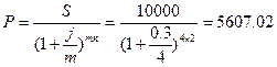 Определите необходимую сумма вклада в настоящем, чтобы через два года иметь накопления в размере 10 тыс.руб. Годовая ставка процента 30%, начисление процентов 1 раз в квартал (схема сложного процента).