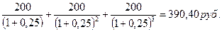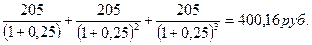 Процентные платежи по облигации представляют собой трехлетний аннуитет с единичным платежом 200 руб. (20% от номинала облигации). Следовательно, для расчета текущей стоимости необходимо величину платежа умножить на фактор дисконтирования аннуитета для трех периодов и ставки 20%: