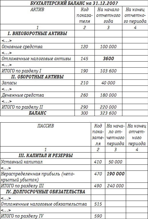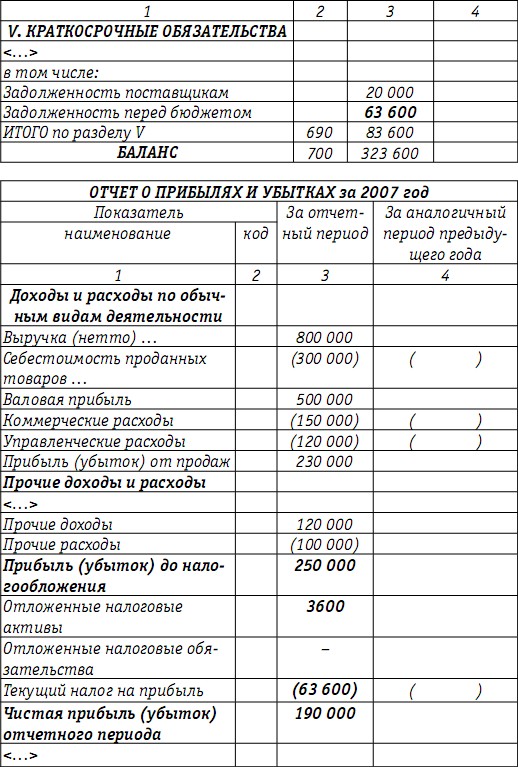 В Бухгалтерском балансе также отражены два компонента налога на прибыль: текущие обязательства перед бюджетом по итогам отчетного года на сумму 51 600 руб. и отложенный налог в качестве долгосрочного обязательства в сумме 12 000 руб. как «недоплата» с точки зрения бухгалтерской прибыли. Эта недоплата должна «сигнализировать» о том, что в последующие отчетные периоды этот налог придется уплатить в бюджет.