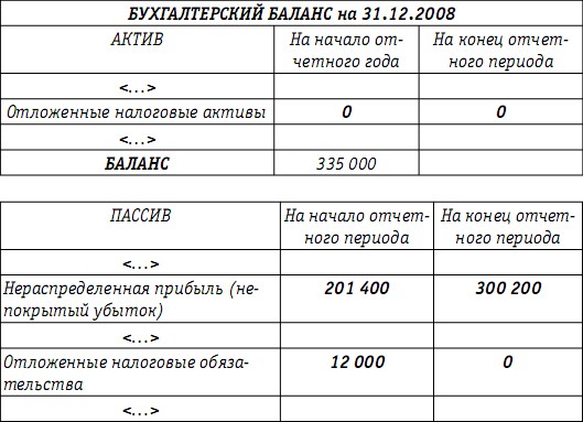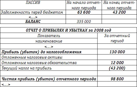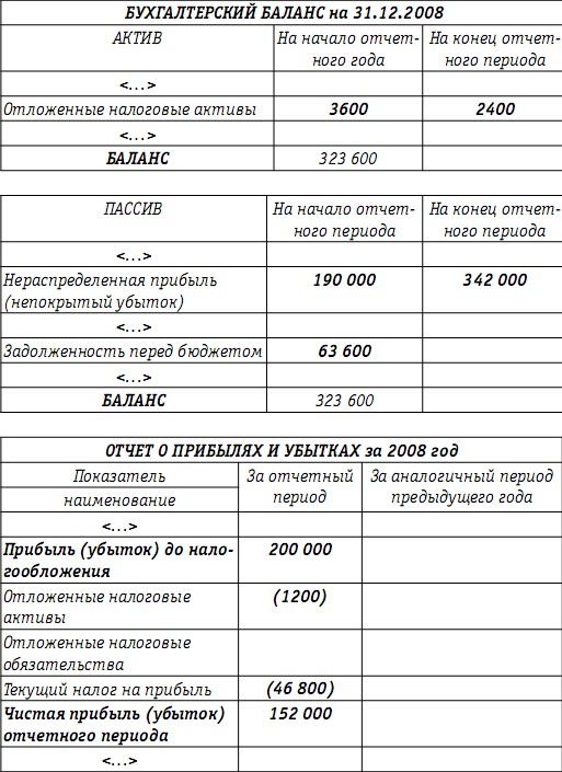 Финансовую отчетность по итогам 2008 года представим схематично с указанием только интересующих статей. Все компоненты расчетов по налогу на прибыль будут выглядеть в бухгалтерском учете по итогам 2008 года следующим образом: