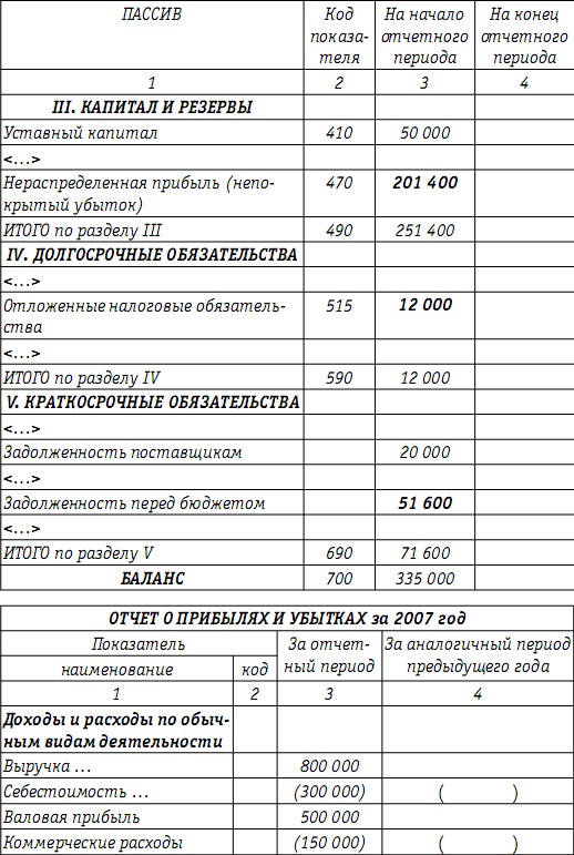 Доход от продажи данной партии товаров в сумме 70 000 руб. (82 600 руб. – 12 600 руб.) и себестоимость проданных товаров в сумме 20 000 руб. не будут учтены при исчислении налогооблагаемой прибыли. Таким образом, за отчетный 2007 год бухгалтерская прибыль составила 265 000 руб., а налогооблагаемая– 215 000 руб. Применяемая ставка налога на прибыль– 24 %. Бухгалтерская отчетность выглядит следующим образом.