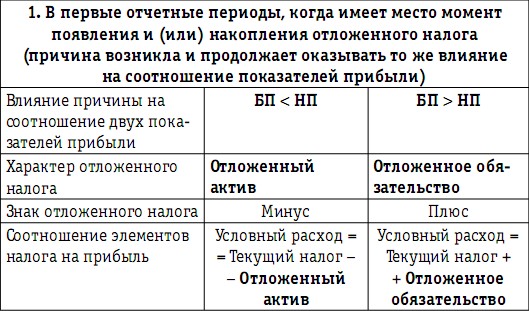 Для правильного формирования информации об отложенных налогах в бухгалтерском учете действие каждой причины, вызывающей их появление, должно отслеживаться налогоплательщиком обособленно в течение отчетных периодов. Существует момент возникновения причины, приводящей к появлению отложенного налога. В этот момент в зависимости от влияния на соотношение показателей бухгалтерской и налогооблагаемой прибыли можно сделать вывод о характере возникшего отложенного налога – отложенный актив или отложенное обязательство. Возможно, что в течение нескольких отчетных периодов отложенный налог будет «накапливаться», о чем будет свидетельствовать увеличение соответствующих статей в Бухгалтерском балансе. Затем действие причины меняется на противоположное, то есть меняется соотношение показателей прибыли в бухгалтерском и налоговом учете под влиянием все той же причины. С этого момента начинается процесс зачета отложенного налогового актива или погашения отложенного налогового обязательства, которые могут произойти одномоментно или протекать в течение нескольких отчетных периодов. Этот процесс будет отражаться в Бухгалтерском балансе в виде уменьшения статей отложенных налогов.