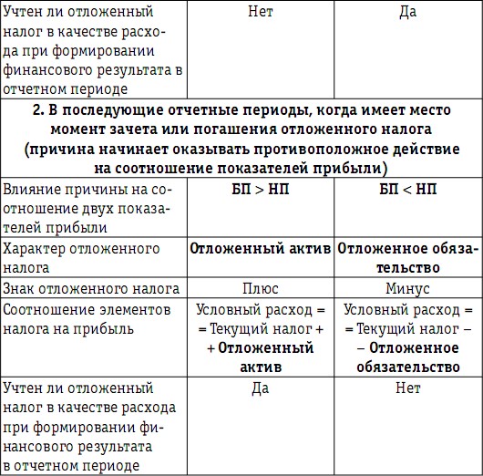 Обобщим в табл. 27 взаимосвязь «жизненного цикла» отложенного налога и его влияния на формирование финансового результата в бухгалтерском учете (БП – бухгалтерская прибыль до налогообложения, НП – налогооблагаемая прибыль, формируемая по налоговым правилам).