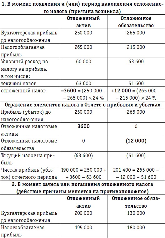 В Отчете о прибылях и убытках с помощью статей отложенных налогов формируется реальная величина чистой прибыли с учетом налога, соответствующего величине бухгалтерской прибыли, вне зависимости от сроков его оплаты.