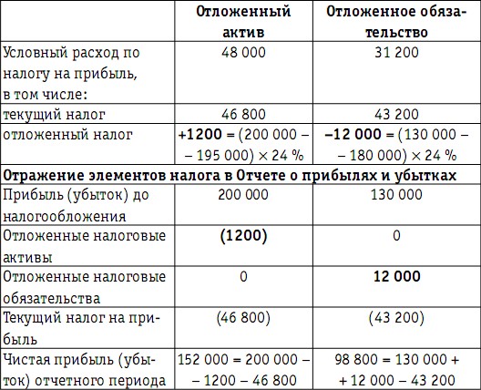 Условный расход по налогу на прибыль (48 000 руб.) в Отчете о прибылях и убытках представлен как сумма текущего налогана прибыль и отложенного налогового актива (46 800 руб. + 1200 руб.).
