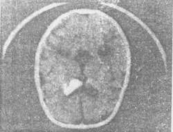 Компьютерная томограмма головного мозга, аксиальный срез на уровне передних рогов боковых желудочков: массивное калкальцинированное опухолевидное образование, практически полностью обтурирующее передний рог правого бокового желудочка.