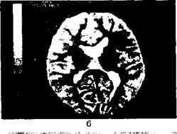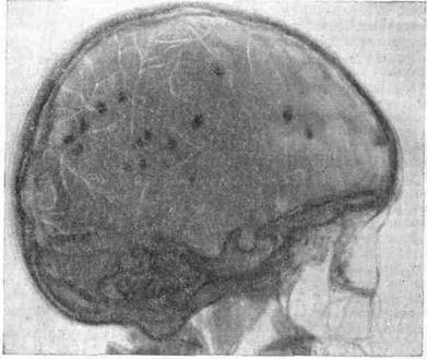 Рентгенологически в костях пальцев рук и ног определяются периостальные утолщения и центральные полости остеопороза. Описаны изменения в большеберцовой и малоберцовой костях. При рентгенографии черепа определяются множественные петрификаты небольших размеров, которые чаще всего локализуются в области III и боковых желудочков, но могут располагаться и в корковом веществе мозга, в мозжечке (рис. 4).