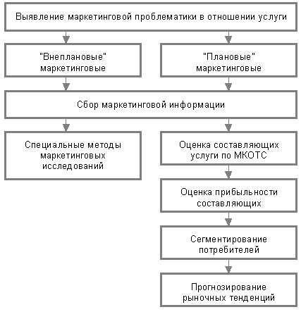 Маркетинговые исследования услуги разделяются по характеру выполнения исследования на "плановые" и "внеплановые" мероприятия. В целом общая схема проведения маркетинговых исследований, включающая ряд методов и методик планового исследования отражена ниже.