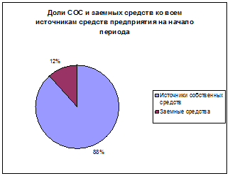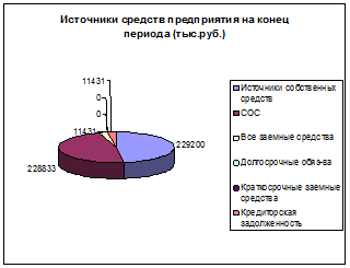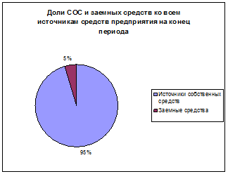 По источникам средств предприятия можно отметить, что их общая сумма возросла на конец отчетного периода на 513,09%. Это произошло в связи с увеличением собственного капитала на 561,19%, который составляет 95,25% от её общей суммы. Наблюдается увеличение суммы заемных средств на 149,37%, которые составляют 75% от общей суммы источников средств. А при увеличении заемных средств на 149,37% наблюдается снижение их доли во всех источниках средств фирмы на 4,75%.