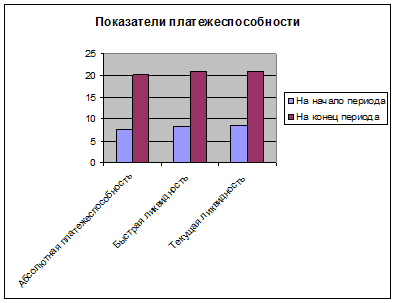 В анализе финансовых коэффициентов показатель абсолютной платежеспособности, показатель быстрой ликвидности, показатель текущей ликвидности и показатель общей платежеспособности возросли почти в 2,5 раза по сравнению с началом и концом отчетного периода, что говорит о том, что все краткосрочные обязательства могут быть погашены за счет денежных средств, текущие пассивы – за счет высоколиквидных оборотных средств, текущие обязательства – за счет мобилизации оборотных средств, а также возросла способность предприятия покрыть все свои обязательства активами, что является очень хорошим показателем. Как показал анализ, активы предприятия имеют оптимальную величину и размер денежных средств на счетах значителен для расположения денежными средствами для текущих расчетов и платежей.