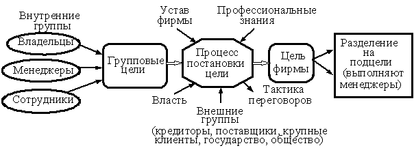 Корпоративная природа менеджмента состоит в том, что выбор цели представляет, как правило, некий процесс компромиссов между интересами различных групп (схема 1)