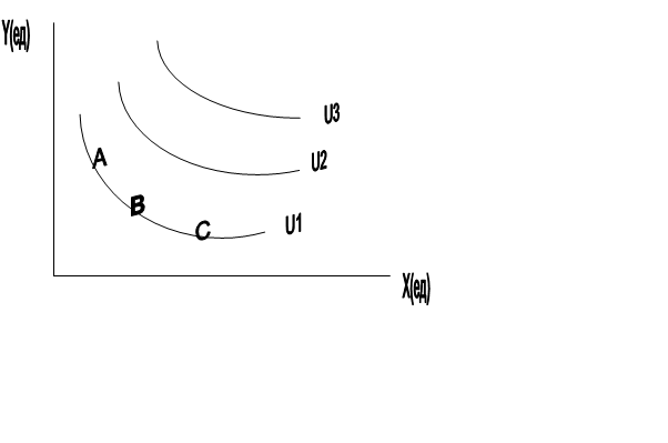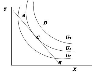На карте кривых безразличия чем выше кривая, тем больше общая полезность. U3>U2>U1