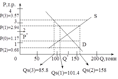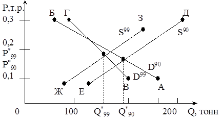 3. Кривая предложения на хлеб в 1990 г. характеризовалась точками с координатами: