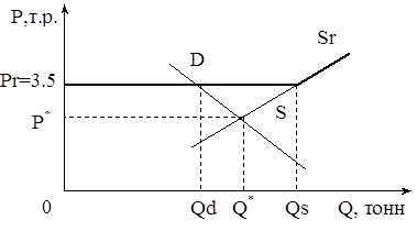 7. Что произойдет, если государство вместо использования налогов и субсидий введет регулирование цен. Если цена, при которой общая выручка продавцов будет максимальна, получается ниже равновесной, то государство устанавливает “ потолок “ цены, если выше - то устанавливает нижний предел цены. Изобразите графически и опишите сложившуюся ситуацию.