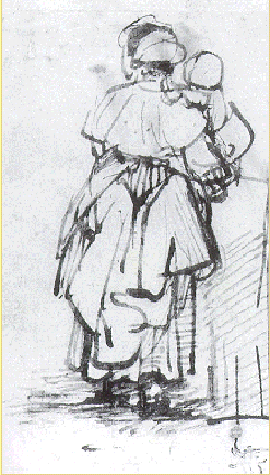 Картины и гравюры Рембрандта гораздо шире известны публике, нежели его рисунки, остававшиеся на протяжении долгого времени предметом интересов небольшого круга собирателей и знатоков. Между тем фигура Рембрандта-рисовальщика ни в чем не уступает Рембрандту-живописцу или офортисту. Рисунки мастера, сохранившиеся в огромном количестве — около 1700 листов, составляют автономную область его творчества. И одной из самых замечательных особенностей рембрандтовских рисунков является их способность делать зрителя свидетелем и соучастником рождения художественной мысли гениального мастера. К числу таких листов относится и небольшая зарисовка „Женщина с ребенком"(1650-е гг. БУМАГА, БИСТР, ПЕРО. 11,1 х 9,7). Исполненная тростниковым пером, она сохраняет всю свободу и непосредственность мгновенного наброска с натуры или по памяти, когда рука художника едва успевает наметить главные линии. Вместе с тем в графических произведениях зрелого Рембрандта даже самые, казалось бы, приблизительные очертания наделены огромной силой обобщения. Может быть потому в маленьком наброске, принадлежащем музею, так поражает умение передать несколькими штрихами не только позу и облик женщины, но и душевное состояние и даже ту атмосферу любви и доверия, которая словно окутывает ее и ребенка.