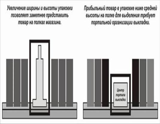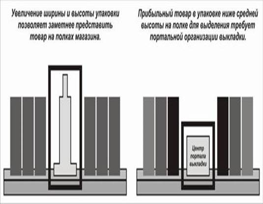 Проектируя упаковку, о вертикальных размерах, иначе ваш продукт будет казаться меньше, чем он есть на самом деле, особенно на фоне рослых товаров конкурентов. Обеспечить желаемый вертикальный размер можно за счёт вытянутой верхней части, объём которой весьма незначителен. Сохраняя объем неизменным, можно увеличить место, отводимое под товар на полках: для этого упаковка может иметь форму пирамиды, конуса или призмы. Если же форма упаковки близка к сферической или кубической (тела, имеющие максимальный объём при минимальных линейных размерах), можно дополнить ее вытянутыми элементами.