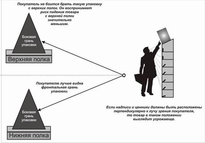 Известно, что, не имея возможности получить информацию о продукте, покупатель либо требует ее – либо уходит. В магазине самообслуживания проблема недостатка информации, казалось бы, исчезает – только протяни руку, возьми товар и прочитай. На самом деле, стоит ли наклоняться к нижним полкам с корзиной в руке или перегораживать проход тележкой в часы «пик» магазина? Основная информация должна быть прочитана при расположении продукта на любой полке стеллажа. Не стоит забывать и о значительной доле торговых точек с обслуживанием через прилавок.