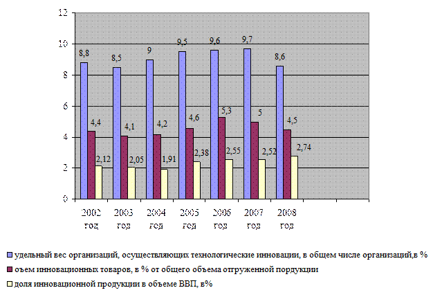 Из рисунка видно, что за 2002-2008 гг. доля инновационно-активных организаций в общем числе организаций промышленного производства снизилась на 0,2 п.п. и составила в 2008 г. 8,6% от общего числа предприятий промышленности (8,822). Удельный вес инновационной продукции в общем объеме отгруженных товаров на внутреннем рынке России увеличился с 4,4 до 4,5% против 15% минимального показателя для современной конкурентоспособности экономики. Доля инновационной продукции в общем объеме ВВП России достигла к 2008 г. лишь 2,74%.