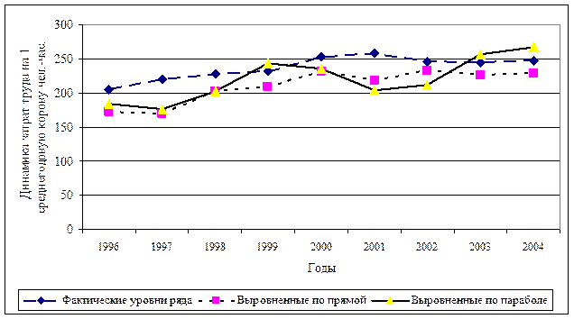 Это значит, что при увеличении t на один год прирост затрат труда на 1 среднегодовую корову чел.-час.повышается в среднем на 5,3 чел.-час.. Построено также уравнение параболического тренда принимает вид: =235,6+5,3t+4,04*t2