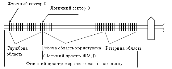 рис. 6. Логічний простір – це, фактично, робоча область диска, що доступна користувачу. Крім службової та робочої областей на диску завжди є резервна область. Сектори резервної області призначені для заміни пошкоджених секторів робочої області.