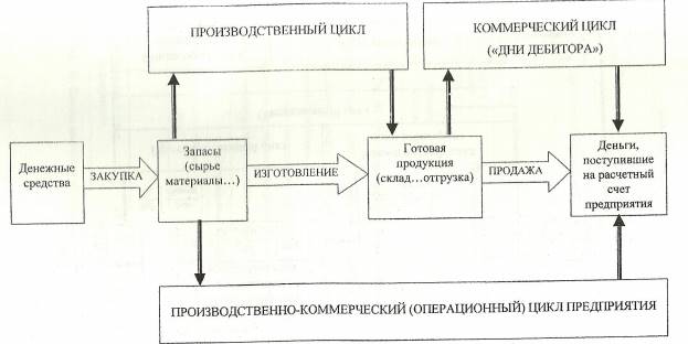 Таким образом, элементы оборотного капитала являются частью непрерывного потока хозяйственных операций. Покупка приводит к увеличению производственных запасов и росту кредиторской задолженности; производство ведет к росту дебиторской задолженности и денежных средств в кассе и на расчетном счете. Этот цикл многократно повторяется и в итоге сводится к денежным поступлениям и платежам.