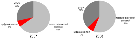 Что касается структуры рынка электронной коммерции по способам доставки, то доля самого крупного сегмента – товары с физической доставкой – неуклонно снижается. По сравнению с 2007 годом, их часть рынка снизилась на 9% и составила 109 млрд. (56%).