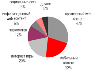 Наибольшей популярностью у пользователей, предпочитающих SMS-платежи, пользуются эротический (30%) и мобильный контент (22%). Игры оплачивают ещё 20% пользователей. Также в списке популярного web-содержимого, оплачиваемого посредством SMS, содержатся сайты знакомств (12%), социальные сети (5%) и информационный контент (6%). То, что SMS-платежи применяются преимущественно для оплаты развлекательных сервисов, объясняется, с одной стороны, скоростью и простотой совершения транзакций, а с другой – невысокой стоимостью контента подобного рода и невозможностью передачи по данному каналу крупных сумм денег. Подобный способ оплаты особенно привлекателен для юных потребителей цифрового контента.