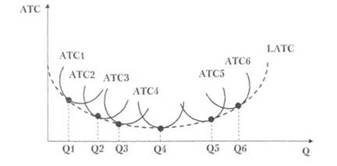 Мы рассматриваем шесть краткосрочных периодов (по 2 месяца каждый), которые составляют один долгосрочный период. Таким образом, через точки минимальных средних общих издержек краткосрочных периодов (при Q1, Q2, Q3, Q4, Q5, Q6). Производитель в краткосрочном периоде добивается увеличения выпуска путем изменения переменных ресурсов. До тех пор, пока действует возрастающая отдача от масштаба в первом краткосрочном периоде, фирма наращивает использование переменных ресурсов до точки Q1. После этого момента производителю становится невыгодно увеличивать переменные затраты в краткосрочном периоде, потому что средние общие издержки (АТС1) начинают расти за счет увеличения средних переменных затрат'1, и действует убывающая отдача от масштаба. В этом случае производителю, чтобы увеличить объем выпуска и размер производства, необходимо изменить и постоянные ресурсы - он начинает действовать в долгосрочном периоде и теперь