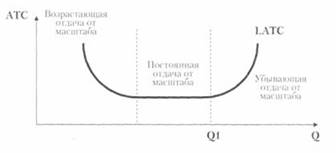 Обычно их называют просто - долгосрочные средние затраты (LAC). Посмотрите внимательно, кривая долгосрочных средних затрат так же, как и кривая средних общих затрат в краткосрочном периоде принимает форму перевернутого колокола. Почему? По той же самой причине - в результате действия эффекта отдачи от масштаба производства. При определении величины долгосрочных общих затрат также может наблюдаться возрастающая, постоянная и убывающая отдача от масштаба. То есть даже в долгосрочном периоде производитель не наращивает свой объем выпуска до бесконечности. На нашем рисунке при переходе от первой кривой средних общих издержек ко второй (от АТС1 к АТС 2) наблюдается положительная (возрастающая) отдача от масштаба. Точка эффективного производства, соответствующая объему выпуска Q2, находится ниже точки, соответствующей объему выпуска Q1, характеризуя при этом более низкий уровень затрат на одну единицу выпуска. В точке кривой долгосрочных средних издержек, соответствующей объему производства Q4, наблюдается самый низкий уровень затрат на единицу объема выпуска. После этой точки средние затраты начнут возрастать и будет действовать отрицательная (убывающая) отдача от масштаба. Это значит, что увеличение размеров производства и объема выпуска с величины Q4 до Q5 уже невыгодно для производителя, не говоря уже о дальнейшем росте выпуска (с Q5 до Q6). В зависимости от того, каков характер отдачи от масштаба, кривая долгосрочных средних затрат принимает самый разный облик: