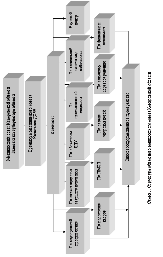 Следующим этапом реализации модели является оценка существующей организации профилактики социально-значимых заболеваний, которая также проводится главными специалистами органов управления здравоохранением с участием представителей всех заинтересованных структур. Целью данной оценки является определение соответствия сложившейся системы организации профилактической помощи потребностям населения, эффективности деятельности существующей структуры организации, выявление неэффективных секторов и разработка предложений по ее совершенствованию. Особое внимание обращается на доступность профилактической помощи в рамках территориальной программы государственных гарантий обеспечения населения бесплатной медицинской помощью, качество профилактической и реабилитационной деятельности, эффективность использования ресурсов здравоохранения. В результате разрабатываются предложения по коррекции программы государственных гарантий и заказов-заданий медицинским организациям. Формированием стратегического направления развития лечебно-профилактической помощи населению области занимается областной медицинский совет, возглавляемый заместителем губернатора по здравоохранению, в структуре которого создан комитет и рабочие группы по профилактике заболеваний и формированию здорового образа жизни (схема 1). Координатором профилактической деятельности является Кемеровский областной центр медицинской профилактики (схема 2).