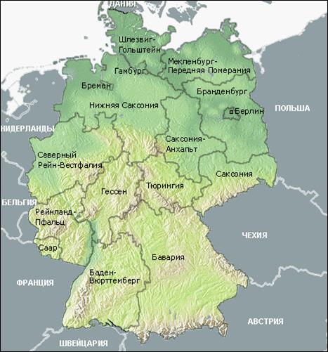 В административно-территориальном отношении ФРГ состоит из 16 земель (см. Схема 1), каждая из которых имеет свою столицу, конституцию, парламент и правительство. Федеральные земли делятся на старые и новые, кроме этого имеется три города - самостоятельных государства – это Берлин, Бремен и Гамбург. К новым федеральным землям относятся: Шлезвиг-Гольштейн (Киль), Мекленбург-Передняя Поммерания (Шверин), Бранденбург (Потсдам), Саксония (Дрезден), Саксония-Анхальт (Магдебург), Тюрингия (Эрфурт) и земля-государство Берлин. К старым федеральным землям относятся: Нижняя Саксония (Ганновер), Северный Рейн-Вестфалия (Дюссельдорф), Рейнланд-Пфальц (Майнц), Гессен (Висбаден), Саарланд (Саарбрюкен), Баден-Вютттемберг (Штутгарт) и Бавария (Мюнхен) и две земли-государства - Бремен и Гамбург.