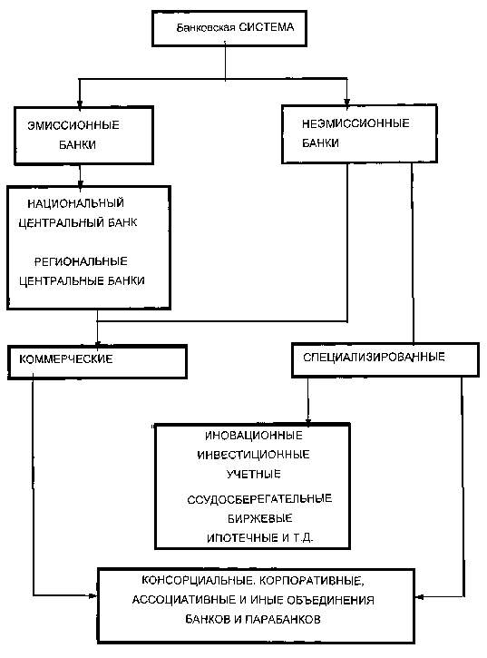 Если в стране в достаточном количестве имеются действующие банки, кредитные учреждения, а также все те экономические организации, которые выполняют отдельные банковские операции, то можно говорить о наличии банковской системы. Помимо них, в банковскую систему входят также специализированные организации, не осуществляющие банковских операций, но обеспечивающие деятельность банков и кредитных учреждений: расчетно-кассовые и клиринговые центры, фирмы по аудиту банков, дилерские фирмы по работе с ценными бумагами банков, организации, определяющие рейтинги банков, обеспечивающие их специальным оборудованием и информацией, специалистами и т. д. При этом банки и кредитные учреждения в разнообразных формах и регулярно взаимодействуют со своими клиентами—субъектами экономики, с центральным банком, другими органами государственной власти и управления, друг с другом и со вспомогательными организациями.