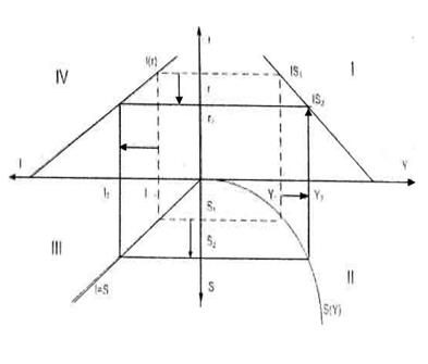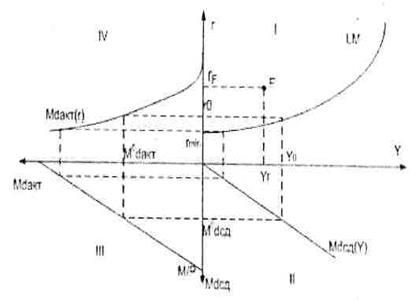 В квадранте IV представлен график функции инвестиций I=I(r), показывающий рост инвестиций как функцию, обратную уровню процентной ставки r.