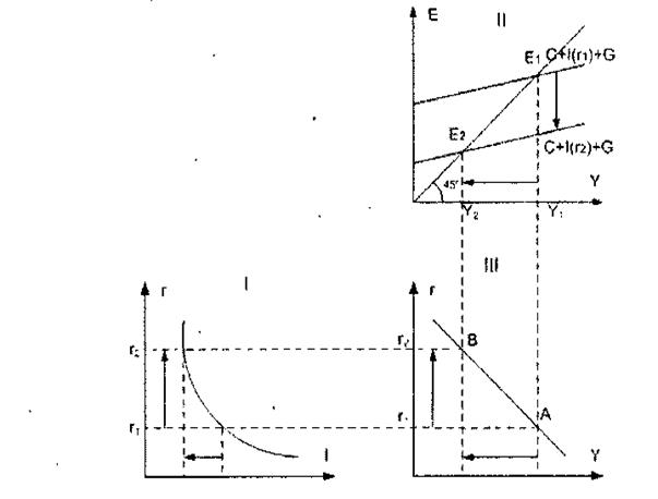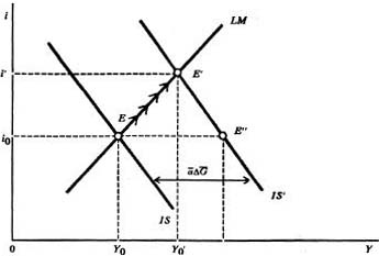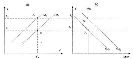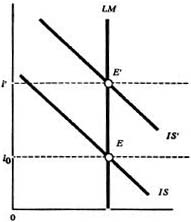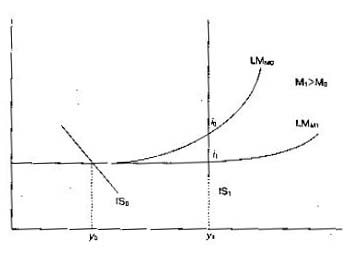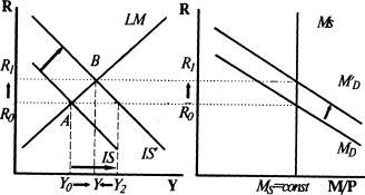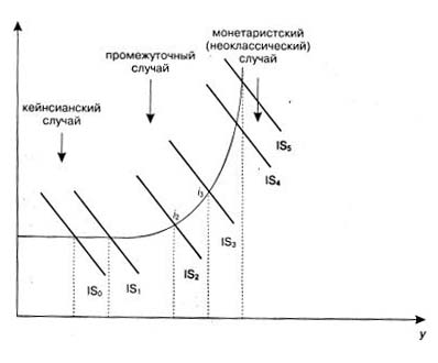 в районе вертикального участка линии LM, не оказывает никакого воздействия на величину дохода, несмотря на увеличение процентной ставки. Увеличение процентной ставки может лишь снизить величину частных инвестиций и частное потребление, при этом произойдет так называемое «вытеснение» частных расходов государственными, и величина совокупных расходов не претерпит никаких изменений, значит и величина дохода также не изменится.