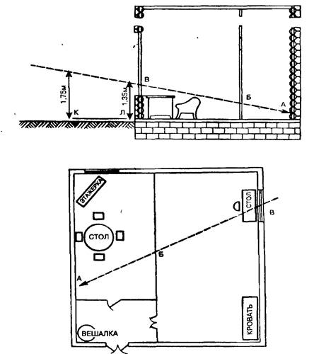 Установив входное и выходное отверстие, можно перейти к установлению места, откуда был произведен выстрел. Это установление осуществляется путем визирования. Его способ зависит от вида и числа пробоин. Простейший способ визирования – это визирование по бумажной трубочке, вставленной в пробоины, имеющиеся в двух стеклах оконной рамы. В случаях, когда пробоины расположены на значительных расстояниях, между ними натягивается нить, направление которой укажет направление полета пули. Следует иметь в виду, что получение, таким образом, данных могут оказаться неточными при визировании на расстоянии свыше 50 м. В этом случае траектория полета пули (кривая) заметно отклоняется от идеально прямой линии визирования. Место, откуда был произведен выстрел, можно установить расчетно-графическим методом. С этой целью составляют масштабные планы места происшествия с точным обозначением на них, нанесенных пулей повреждений на предметах обстановки, которые соединяют прямой. Вертикальная проекция – на восходящее или нисходящее направление полета пули и его уровень (вид сбоку). Горизонтальная проекция плана показывает расположение линии полета пули относительно предметов обстановки (вид сверху) (см. Приложение 1).