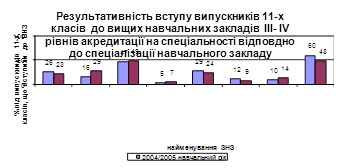 - не повною мірою реалізується принцип наступності між загальною середньою і вищою освітою. Так, 76% від загальної кількості випускників даних загальноосвітніх навчальних закладів 2004/2005 навчального року вступили до вищих навчальних закладів на спеціальності, що не відповідають спеціалізації навчального закладу, даний показник в 2005/2006 навчальному році становить 75% (дані по навчальних закладах представлені в діаграмі 11);