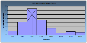 Анализ диаграммы показывает, что распределение не подчиняется нормальному закону. Явно выражена правосторонняя, то есть положительная, асимметрия, из чего можно сделать вывод о том, что большинство значений признака сконцентрировано слева от средней и имеет значение, меньшее, чем среднее. По гистограмме можно приблизительно определить моду, значение которой попадает в середину третьего интервала и составляет приблизительно 22%.