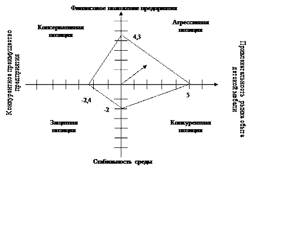 В зависимости от вида полученного графика предприятие относят к одной из 4 стратегических позиций: агрессивная, конкурентная, консервативная, защитная. В соответствии с выявленной в результате исследования позицией можно рекомендовать соответствующие стратегии для дальнейшего развития предприятия.