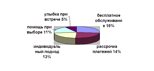 Клиенты ориентируются в первую очередь на индивидуальный подход, предоставление рассрочки и бесплатного обслуживания после приобретения товара. Помощь при выборе тоже необходима, но это зависит сугубо от желания клиента. И, как оказывается, улыбка при встрече необходима только для самого малого числа клиентов.