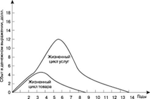 Рисунок 1 - Различия в кривых жизненного цикла товара и сопутствующих ему (сервисных) услуг