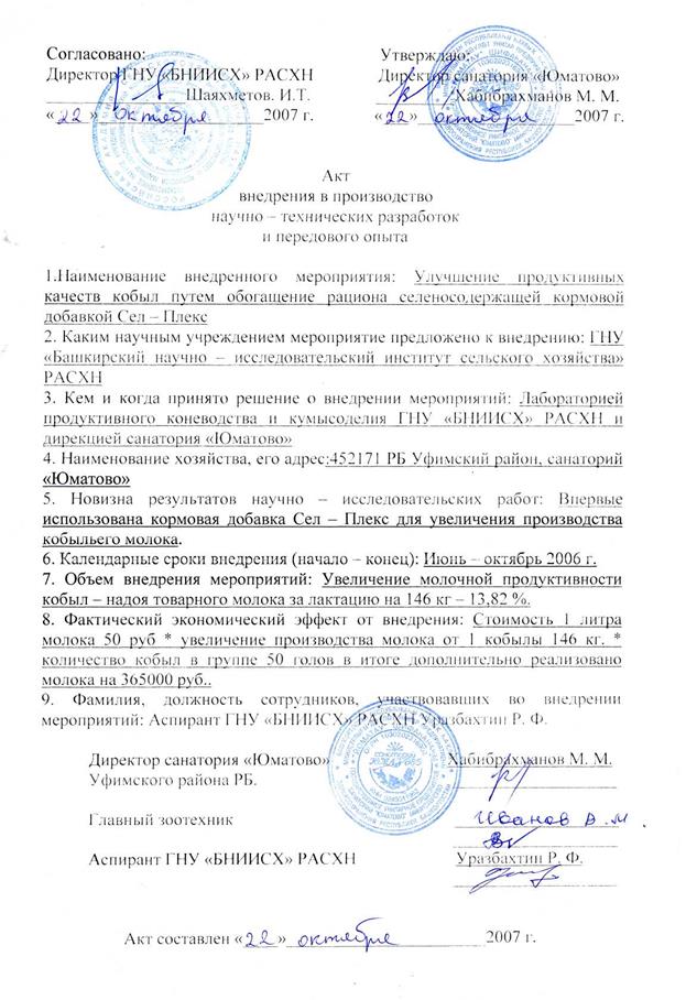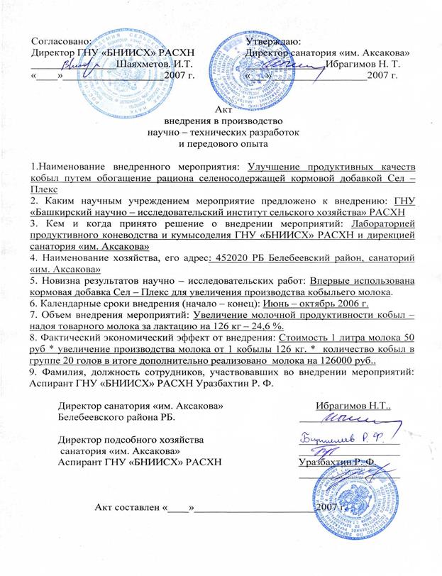 . Результаты исследований внедрены на конефермах санаториев им. Аксакова, «Юматово» и других кумысных фермах Республики Башкортостан.